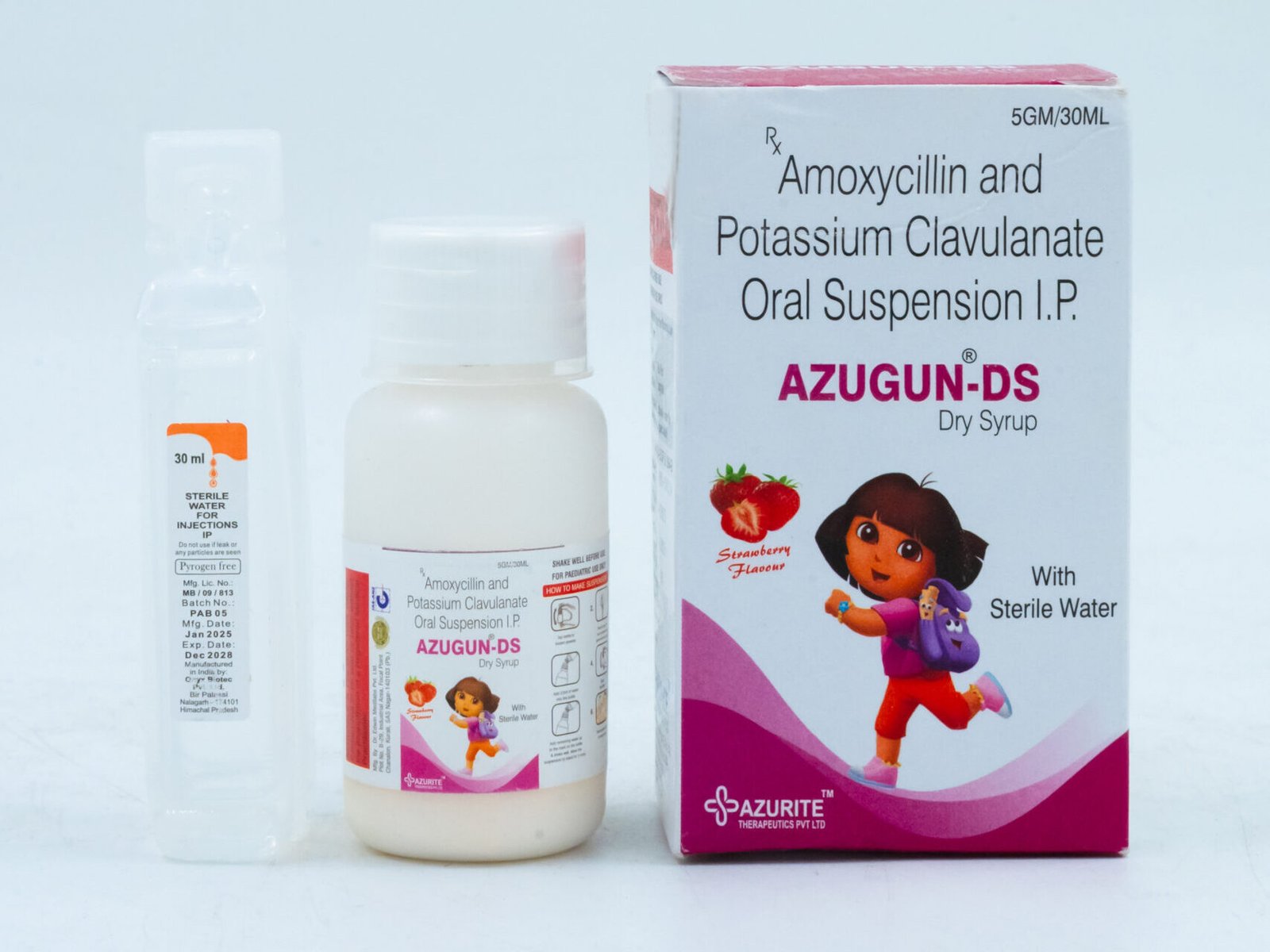 AZUGUN-DS Dry Syrup is a combination of Amoxicillin and Potassium Clavulanate specially formulated for pediatric infections. It provides broad coverage against respiratory, urinary, and skin infections. With its child-friendly taste and high absorption, AZUGUN-DS ensures faster recovery and excellent tolerance in young patients.